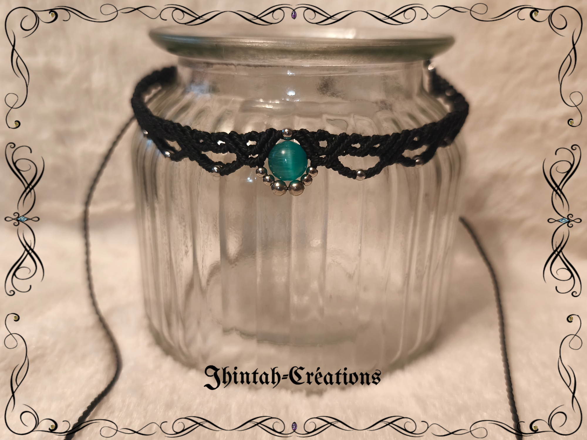 Le collier ras du cou Carnil est réalisé en macramé agrémenté d'une perle œil de chat et de perles an acier inoxydable.